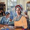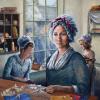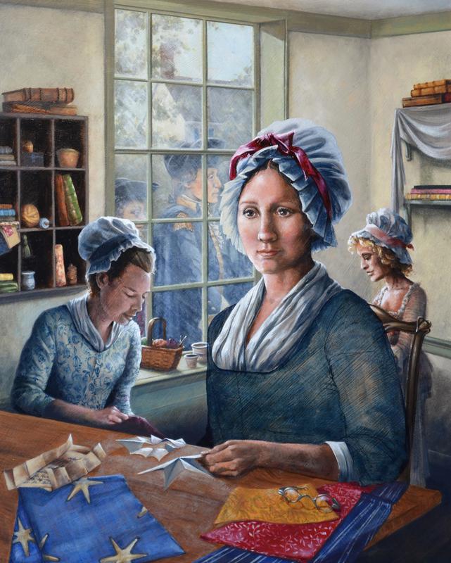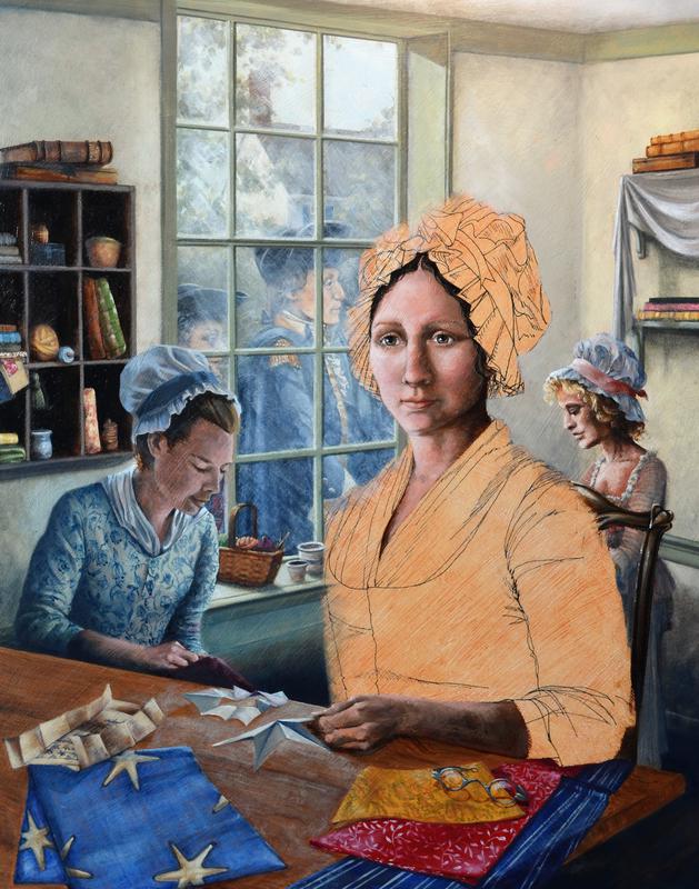 This is a painting of my interpretation of the moment after General George Washington, Colonel George Ross and Robert Morris spoke with Betsy Ross about designing and sewing a flag for the new united colonies. They visited her upholstery shop in Philadelphia with a suggested design that contained six pointed stars, however, Betsy suggested a five pointed star instead. She demonstrated how to cut the pattern and now holds it in her hand as she thinks of this new project and what is to come for the United States of America.